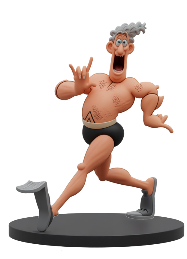 The character sports Aquaman’s classic look — trident, orange and green uniform, beard — but with the exaggerated features, flexible joints, and caricatured expressions characteristic of Don Martin. The sculpture materializes the physical humor and graphic energy of the artist’s comic strips, turning a heroic action scene into a vibrant visual satire full of movement.