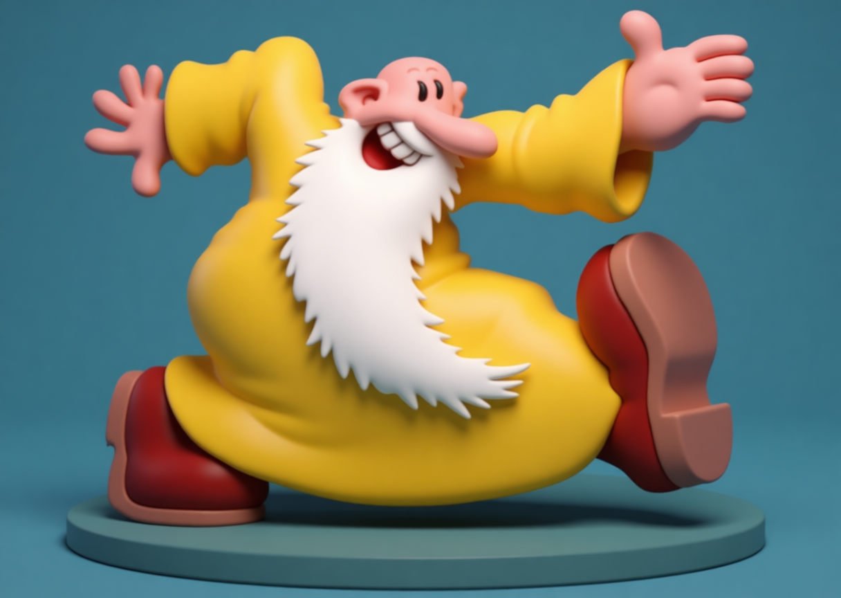 This is a three-dimensional representation of the legendary “Mr. Natural”, the bearded, cynical, and profoundly iconoclastic guru created by Robert Crumb. Mr. Natural is a biting satire of spiritual gurus, authority figures, and the search for meaning in a hypocritical society. The figure captures his imposing yet absurd presence: a robust body, long disheveled beard, bowler hat, round glasses, and an expression that mixes feigned wisdom, existential weariness, and a penetrating gaze of disdain.