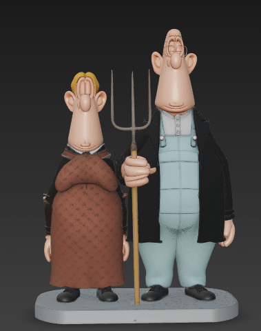 A peça preserva os elementos visuais essenciais da obra original — postura rígida, composição frontal e referência direta ao quadro histórico — enquanto adiciona distorções cômicas, traços elásticos e um tom irreverente típico do cartoon underground americano. O resultado é um encontro criativo entre história da arte e humor pop, transformado em Toy Art tridimensional.