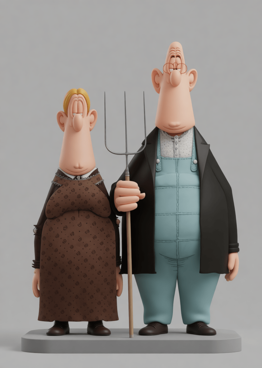 janeiro 8, 2026A American Gothic Collectible Figure é uma releitura divertida, ousada e estilizada da icônica pintura American Gothic, reinterpretada através do humor gráfico inconfundível de Don Martin, lendário cartunista da MAD Magazine. A clássica cena do casal rural diante da casa em estilo Carpenter Gothic ganha aqui uma nova vida, marcada por exageros anatômicos, expressões caricatas e o espírito satírico que consagrou Martin.