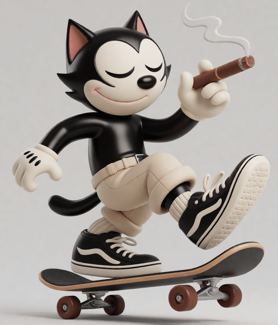 Com expressão relaxada, charuto na mão e postura confiante sobre o skate, Felix evoca memórias dos desenhos vintage, das manhãs de sábado e da era dourada do design de personagens. A peça funciona como uma homenagem à imaginação, ao humor e ao prazer de colecionar ícones da cultura pop reinterpretados como arte de designer.