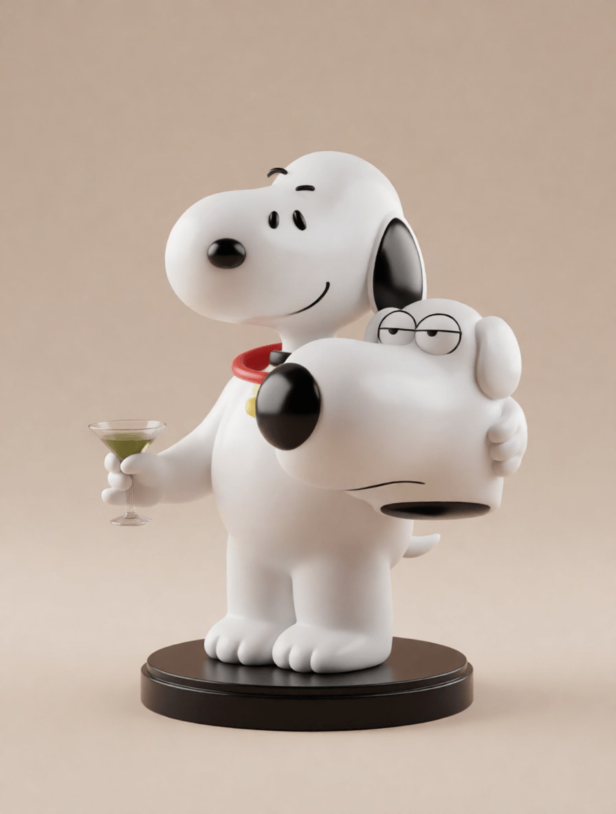 Esta figura colecionável apresenta Snoopy habilmente disfarçado de Brian Griffin, criando um cruzamento espirituoso e visualmente impressionante entre dois personagens icônicos da cultura pop. A peça brinca com identidade, sarcasmo e referências animadas, resultando em um brinquedo colecionável ousado e bem-humorado.